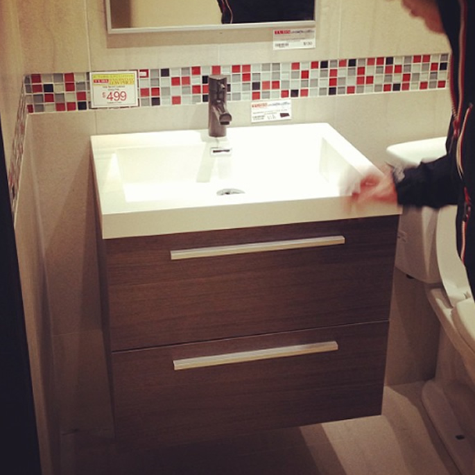 Then I spotted the modern walnut vanities at Tubs and things instantly fell into place. Tubs had the exact style of vanity that we were getting custom cabinetry makers to quote us on with the exception that the vanities at Tubs had handles. It was a great Ah-ha moment that the "Bath" stores that I thought were going to be out of my budget weren't - and that Big Box Stores like Lowes and Home Depot aren't the only place where you can find a huge selection of vanities. But there was a little bit of a downside to the vanity that I had decided on.